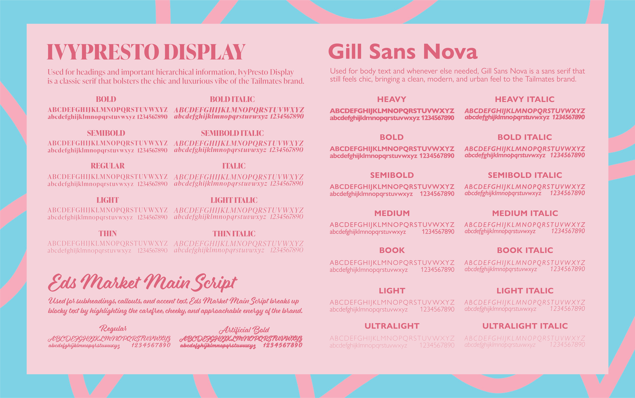 Ivy Presto Display is used for headlines to bring in a sense of personality and charm. Its slightly whimsical, editorial feel adds a touch of sophistication while still feeling playful and expressive. This typeface helps elevate the brand, making it feel both stylish and unique.